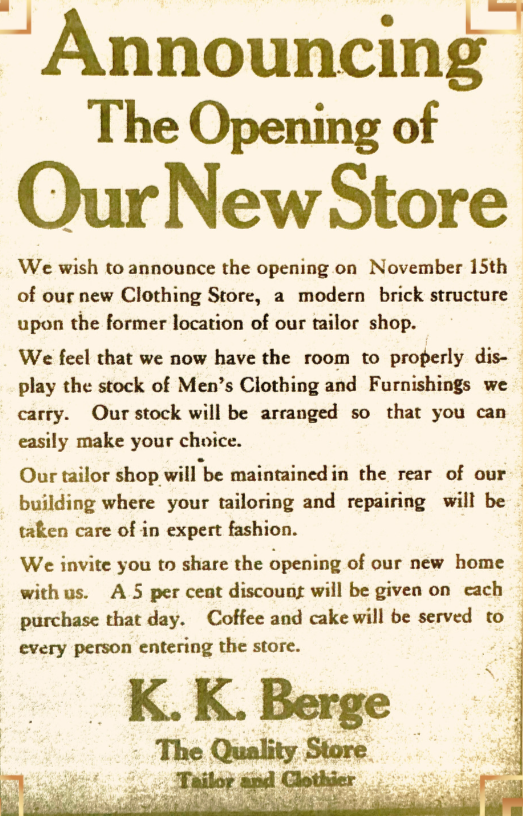 K. K. built the Berge Building in a prominent location near the footbridge and across from the Opera House and Yellow Medicine County Bank. He operated for several years a dry goods store of fabrics and ready-made clothes along with his tailoring of altered and custom-made clothes. His children reported that while young one of their tasks was to go to his shop and thread needles for him. One advertisement lists men's handmade suits at $15.00.